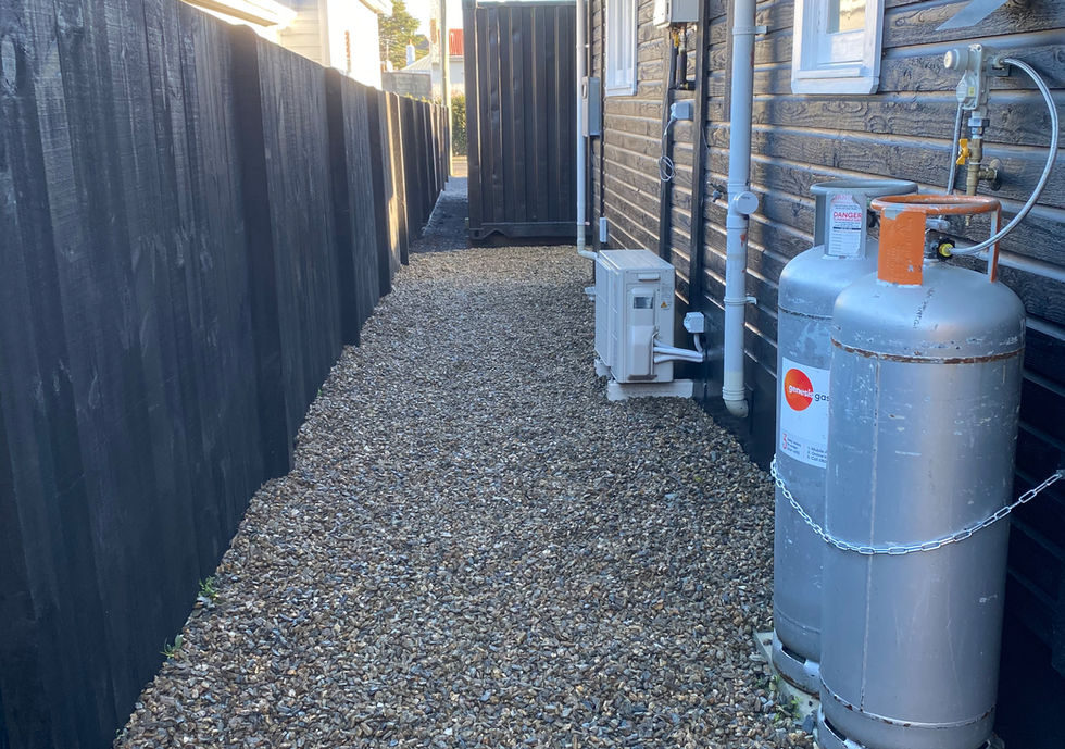 The front of the yard is a large off-street parking area and the front concrete path area was water blasted and a fresh layer of gravel was laid to tidy up this area. The deck area and trellis fence also received a water blast.